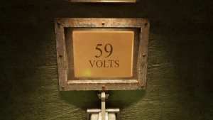If you do trip the power, you will need to head back outside and reset the fuses. There are two switches at the top of ladders against brick columns; you need to pull each of these once to reset everything and get it working again. To create exactly 59 volts with the buttons you have available, you will need to press buttons 2, 3, 4, 5, 6, and 8.