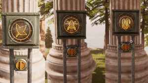 Leave the library and go into the round building next to it with the gold sigil on the door. The sigil has three men carved into it. Inside this building is a machine that you can input those three dates into, and it will spit out constellations (Randomized). The base game has the dates October 11, 1984 10:04, January 17, 1207 05:46, and November 23, 9791 18:37 (remember to translate all PM times to military/24-hour time before putting them into machine).