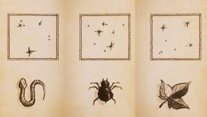 The Stoneship Age diary contains the constellations translated into animal pictures. The three dates above correlate to the Snake, Bug, and Leaf. Turn on the third column on the left of the small pool outside the library, and the two middle ones on the right. This will raise the small boat from the water in the middle of the island as well as the large boat down at the docks. There is a linking book on the boat.