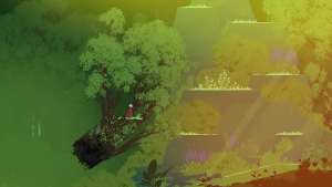Right after the section where you have to cut the corrupted part of the tree to get by, there will be a second tree you you have to cut through the corruption of. Once you have jumped over the platforms and cut the tree, you can use the tree you cut to jump up to the higher platforms. There will be a flower at the top.