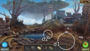 - d7. Use your axe on the partially-chewed tree trunk. This gives you a path to cross the water.