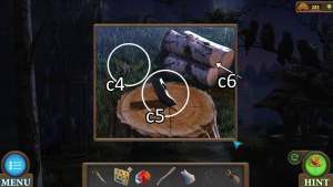- c3. Click the stump to approach. As you get closer you'll pick up the feathers (c4) and extract the axe blade (c5) from the wood. In your inventory, click on the axe blade to pull it up and add the handle you picked up earlier. This doesn't quite fit, so you'll need to use the ritual knife again to pare down the handle and make yourself a full axe. With that done, click the logs (c6) and use your shiny new axe to make some firewood!