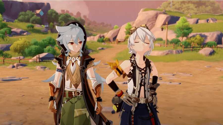 Lyney (left) and Lynette (right) are upcoming characters in circus-esque attire. Perhaps they chose to team up because of their matching grey hair color.