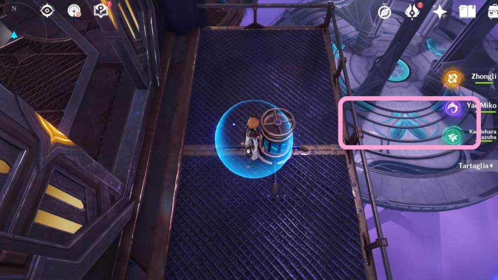 Keep going until you're at the edge of the metal platform, then carefully jump onto the moving platform. Wait for the elevator to stop in front of another metal platform, then hook onto the Four-Leaf Sigil on the opposite side (pictured above). Next, climb the pipe to find a room with an Anemo Fatui Skirmisher. Defeat him to proceed.