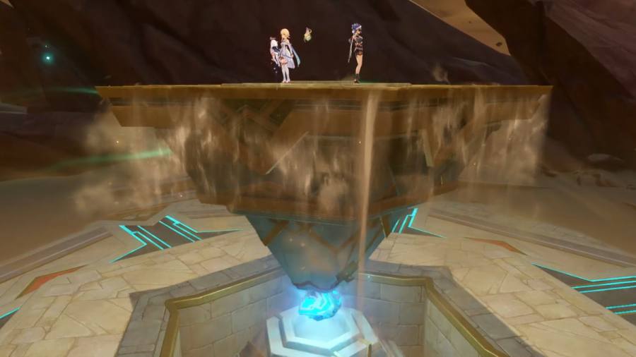 After Ferigees has been defeated, dialogue with the exploration party will trigger. Then simply step onto the center of the platform to trigger dialogue and a cutscene of the platform's elevation, taking you to another area in the desert.