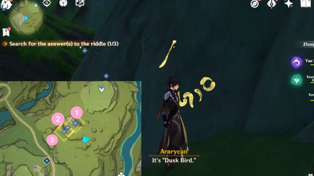 In this segment, three quest markers will appear in the World Map and mini-map, indicating the locations of the three answers. You can interact with them in any order, but you must memorize the order that you interact with them. For example, if you interact with the rightmost answer first, then the middle, then the left, make sure to take note of this order as you need to remember it for the next puzzle.