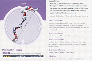 To get the Predator Bow, you have to be Adventure Rank 20 or higher and log in to Genshin Impact after the Version 2.1 update on October 13 on PlayStation 4 or 5. Upon doing so, you'll receive the Four-Star bow in your in-game email. If you log in after update 2.3 has rolled out, you will not be able to claim this bow.