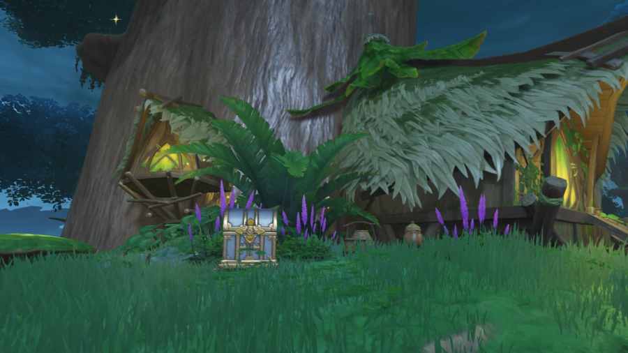 Approach the runes to the left of the hut (obscured by the plants) to prompt a Luxurious Chest to spawn. If it doesn't spawn, try relogging to debug. And if that doesn't work, then backtrack and make sure you've lit up all seven runes.