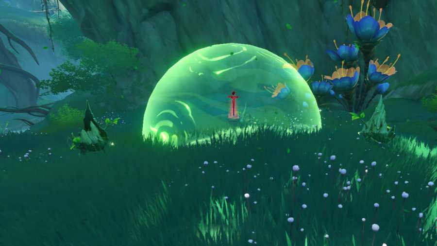 Interact with any Sprouting Branch to summon Healthy Dendrgranum. When the Healthy Dendrogranum is still active, shoot down one of the three floating projectiles around the area, pictured above. Do the same for the other two, but remember to summon Healthy Dendrogranum every time. Once all three floating projectiles have been shot (indicated by a Dendro symbol at the center of each), the Dendro Barrier will disperse.