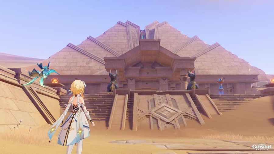 Finding the stage for this boss battle is thankfully straightforward. Travel by foot to the Dune of Elusion in the Sumeru desert. Unlock the waypoint so you can return here quickly next time. The Algorithm Matrix is just inside the pyramid.
