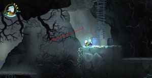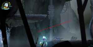 Upon entering the area, continue down until you see the ladder. From here, go left by climbing on the vines or jumping over. Keep going left, then fall down, and keep going to the left at the seesaw/scales.