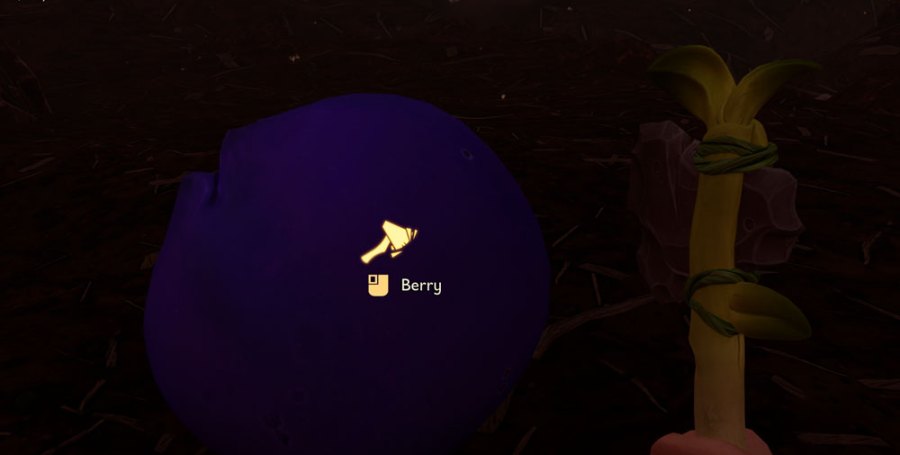 Once you reach the big bush, you will see big blue berries hanging from the branches. You can find some on the ground as well, but if you have a bow you can just shoot them down. Take out your axe and chop one up. You will get a Berry Chunk from it, which you will now need to take to a Field Station. Lucky for you there's a Field Station right in the big bush, so you can do the research there if you'd like to!