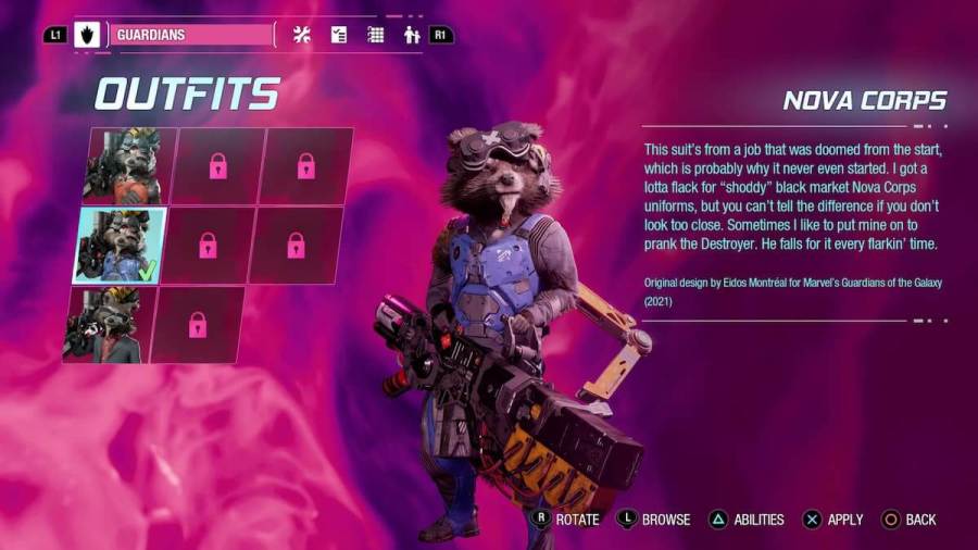 The Nova Corp outfit worn by Rocket in Marvel's Guardians of the Galaxy is more confusing to find than other outfits. Upon returning to Nova Corp Rock, players can find it in a hidden door when solving the electric puzzle.