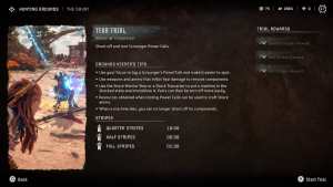 The first Trial of The Daunt Hunting Trials is the Tear Trial. This has Aloy shooting out the Power Cells of Scroungers and then looting them. Aloy's Tear Damage isn't too high at the beginning of the game, but a fully charged arrow or two will still be enough to knock off the Power Cell. If players are having trouble knocking it off, they can use Coils to increase their Tear Damage.