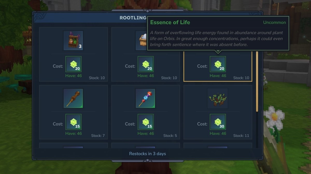 Essence of Life is an item that usually drops when collecting plants. It is an in-game currency that can be traded in for various resources bought from an NPC vendor called Rootling Merchant.