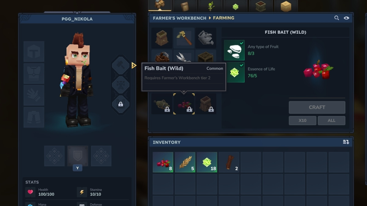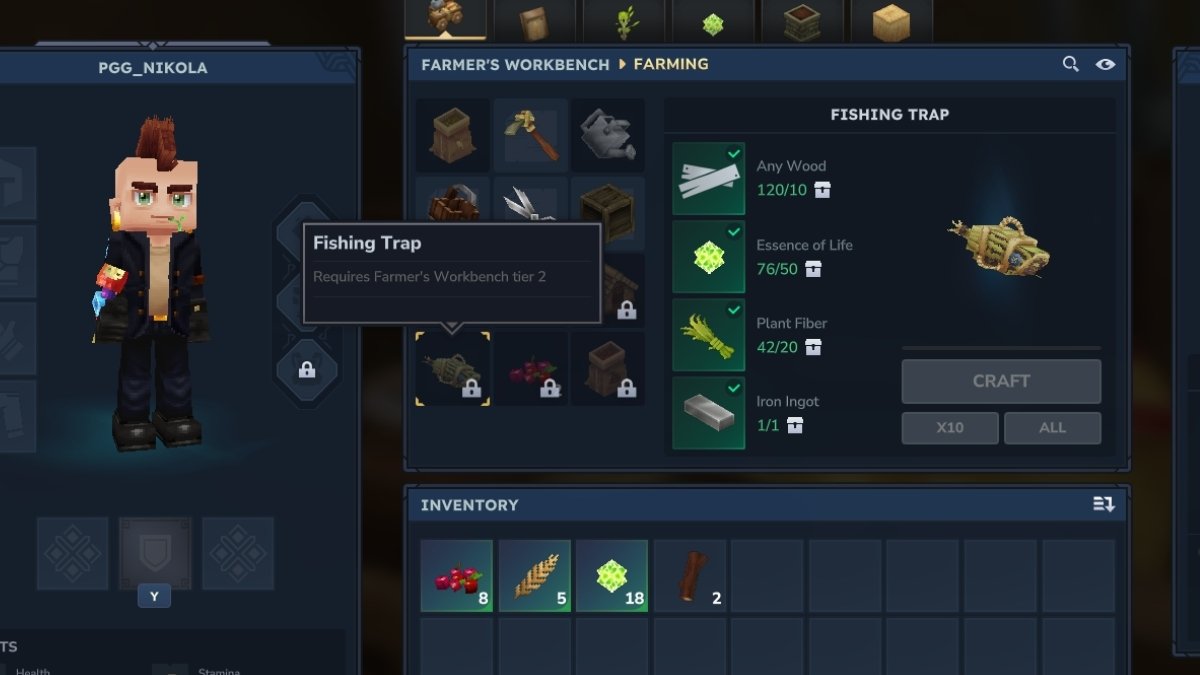 - From the Farming tab in the Tier 2 Farmer’s Workbench, select Fish Trap or Fish Bait to craft them.
