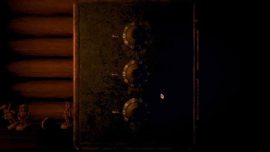 One such object is the safe. Once the player stands up, they will need to turn right and walk to the far wall. The safe is beside the door. It requires a combination of three numbers to open. The player will receive these three numbers as part of a hint from one of their cards later on in the game. It is possible, however, to open the safe early.