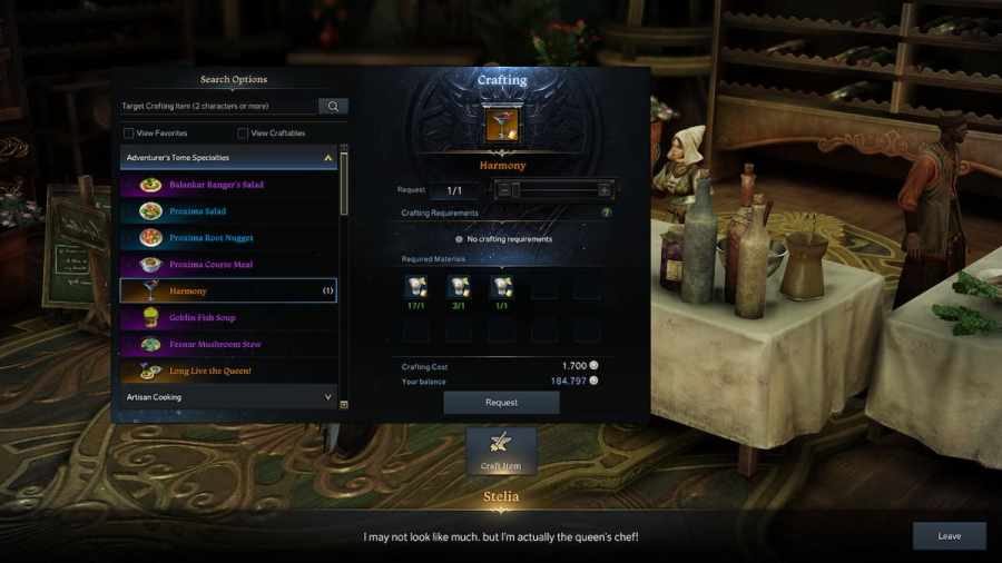 Once you have the three components needed, you can craft Harmony via Stelia the cook in Vern Castle. You'll also need 1,700 Silver to craft Harmony