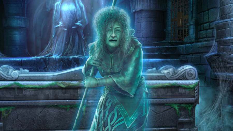 Once done, several spirits will appear around the altar. Go back to the crypt, and the witch’s spirit will be floating above the clover patch (b1). Click the witch Fahira for a cut scene, after which you can click the crypt itself (b2), which is now open. Take Fahira’s Hand from the coffin, along with a Rung.