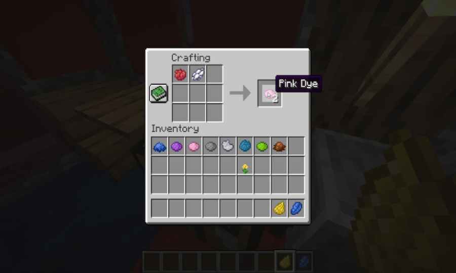 Once you gather any of these materials, place them in a crafting table, and then place both the white and red dye to turn them into a pink dye.