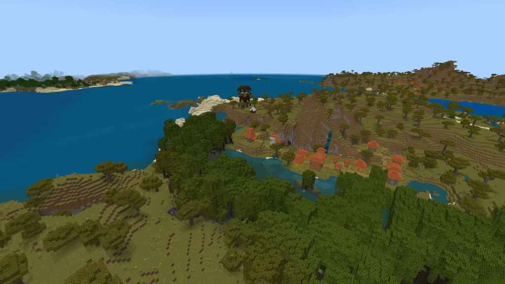 This seed starts you off on a Plains Peninsula at the edge of a Lukewarm Ocean. The peninsula itself contains a Plains Village as well as an underground mineshaft. An easy 450-block boat ride away is a large Mushroom Island surrounded by lots of shipwrecks! The ocean additionally contains many more treasures in the forms of Ocean Ruins and Ocean Monuments.