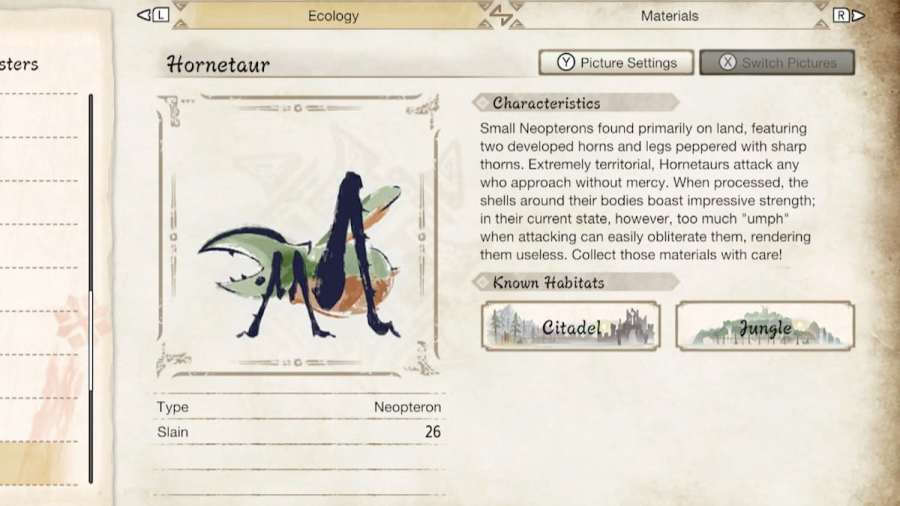 Players can find Hornetaur in both the Jungle and Citadel maps in Master Rank Quests and Expeditions. They are Small Monsters that can have Outbreaks during Expeditions, and both Hermitaur and Vespoids can usually be found near them. Hornetaur materials can be obtained as Quest Rewards for Buggin' Out!, the Meowcenaries, and by carving Hornetaur. These are all the materials Honetaur can possess: