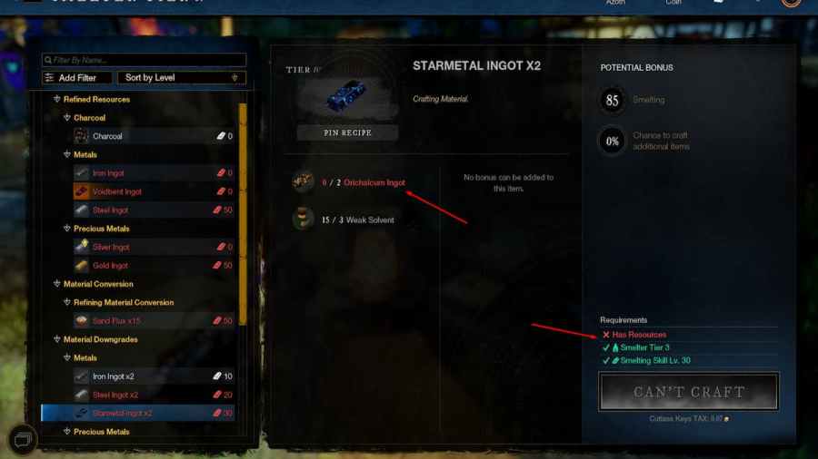 Recipe 1 will require the use of a level four smelter, while recipe 2 will require the use of a level three smelter. A smelter's level will increase if a town upgrades it. If you prefer not to track down any of these ingredients, you can purchase Starmetal at trading posts, though you will be at the mercy of player prices.