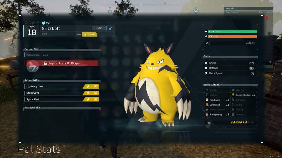 Grizzbolt has very solid stats for an electric Pal of his caliber. For combat, his signature attack, Lightning Claw, is a powerful melee-based AOE attack that deals high damage and provides a consistent Paralyze effect at the end of the final attack. Grizzbolt is also on the beefier side of things, as his health pool is reasonably high compared to many other Pals.