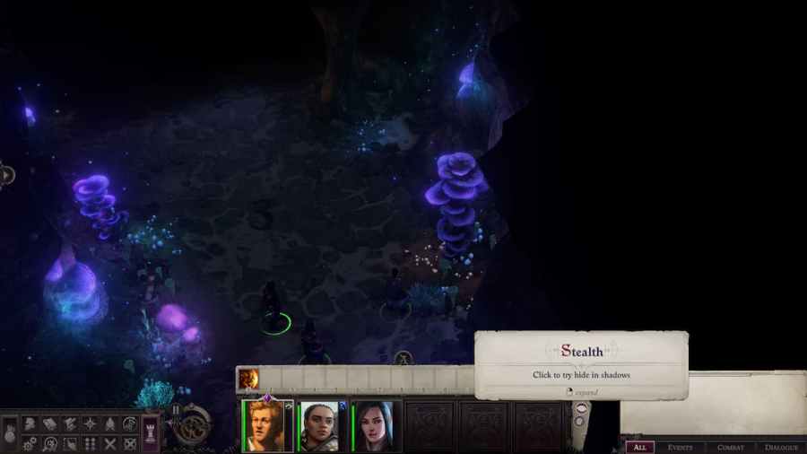 To do so, click on the eyeball icon on the right of your party's portraits. You can have your entire party stealth or click on individual characters to have only one enter stealth. When a character enters stealth, their silhouette will darken and their movement speed will drop dramatically.