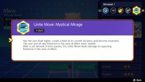 Mew's Unite Move unlocks at level eight and has a 123-second cooldown. When activated, Mew will become invincible for six seconds and make itself and all allies within the activated field fully stealthed. After players come out, the field will damage anyone within it. Attacking while being stealthed will also take Mew out of stealth, requiring some coordination with teammates to use effectively.