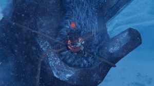 After each strike, the boss will attempt you shake you off. You need to stay grabbed onto the boss, so you don't get thrown off and have to do the climb again. Once this bell has been rung three times, you need to make your way to the left shoulder of the boss and do the same, to the bell located there.