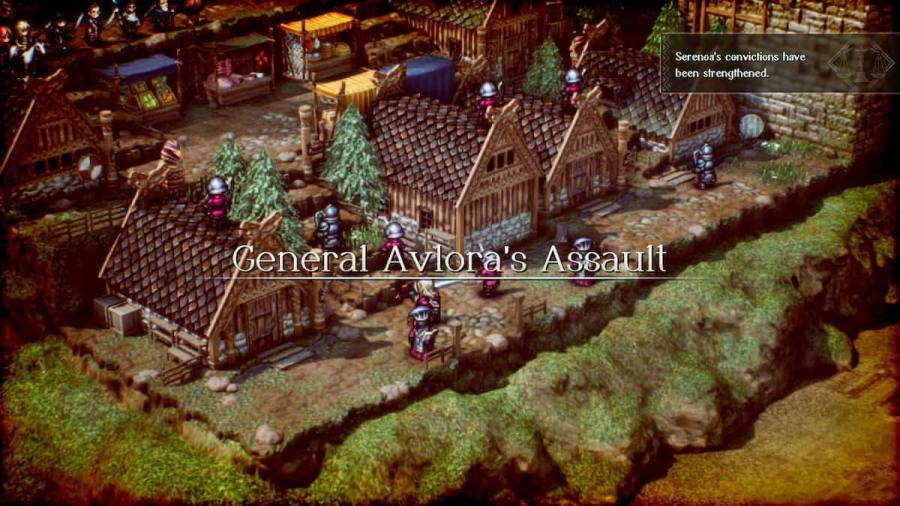 Triangle Strategy's Chapter VII, Part II: Not a Word, My Friend opens at Wolffort Streets, where you await General Avlora after your party decided not to surrender Roland to Aesfrost. A new battle, General Avlora's Assault, will commence once you choose your units. To win, "decimate all enemy forces." To lose, you'll have to see your last ally perish.