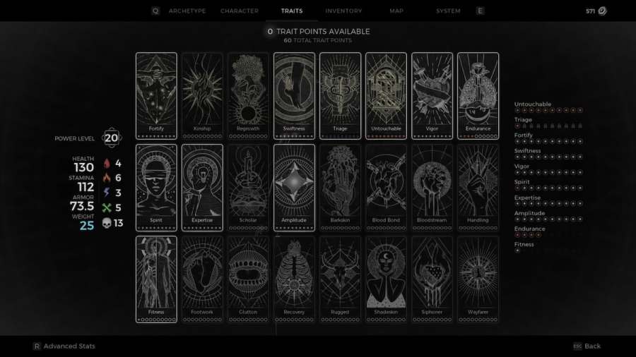 These are bread-and-butter traits and, for most builds, should be invested in to some extent. Personally, I recommend maxing out Vigor and Spirit. This next set of traits is obtainable by maxing out or playing as a specific Archetype: