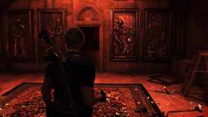 In the Treasury of the Castle, one of the swords needed for the puzzle requires Leon to shoot the matching symbols in the next room. On Hardcore difficulty and above, multiple of the same symbol can be found in the room, but it just serves as a minor distraction. When placing the swords in the murals, the order from left to right is the Iron Sword, Golden Sword, Bloodied Sword, and Rusted Sword.
