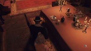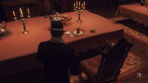 The Dining Hall Puzzle requires that Leon and Ashley sit in two different places and ring the bell. The places can be seen by looking at the large painting on the other side of the room that depicts two different sets of silverware. For Ashley, this is the last rightmost seat at the first table, with two knives, a spoon, a fork, and an empty plate. For Leon, this is the last leftmost seat at the second table, with three knives, two forks, a spoon, a plate with a loaf of bread, and a glass bottle.