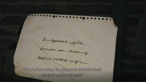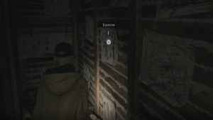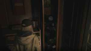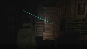 Solving the locked cabinet puzzle that holds the scissors you need to open Mr. Monkey's stomach requires a number code in Resident Evil Shadows of Rose; luckily getting the number code you need is not hard. In short, you must look for hidden numbers hinted at by various locations written on the back of a child's drawing. You can find the drawing as shown below before you enter the Study via the hole-in-the-wall passageway.