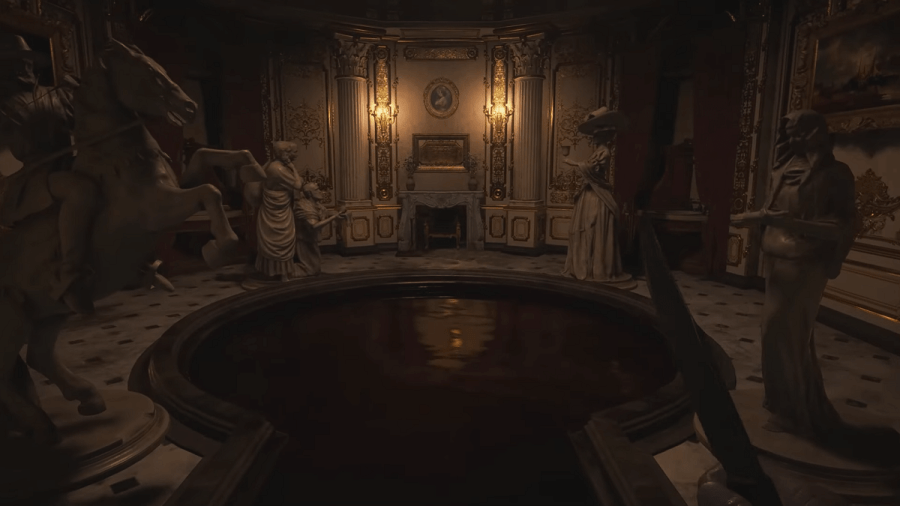 To move the statues, all you need to do is stand behind them, and the option to interact with them will appear, then rotate to the correct alignments. Once this has been done correctly, the pool of wine/blood will drain, and players will be able to progress further into Castle Dimitrescu.
