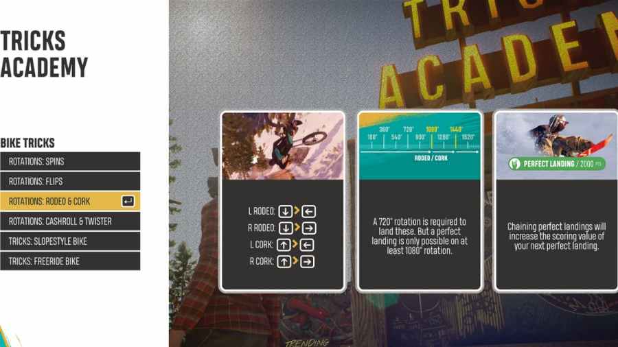 The Rodeo and Cork on your bike are not the simplest of tricks, as they require quite a lot of body rotation. You won't get as many points if you land wrong or bail out and land badly. The training section for this in the academy has you perform each trick twice and then requires you to do them perfectly three times.