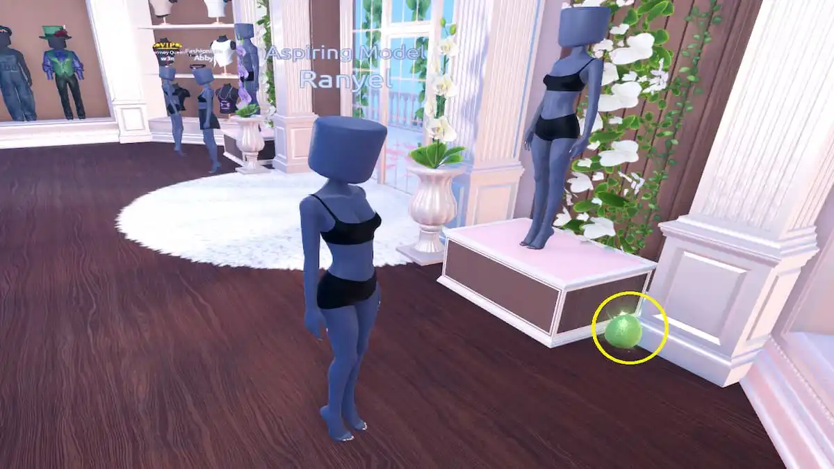 The first Easter Egg is located next to the dummy statue near the window behind the Kirameki District showpiece area.