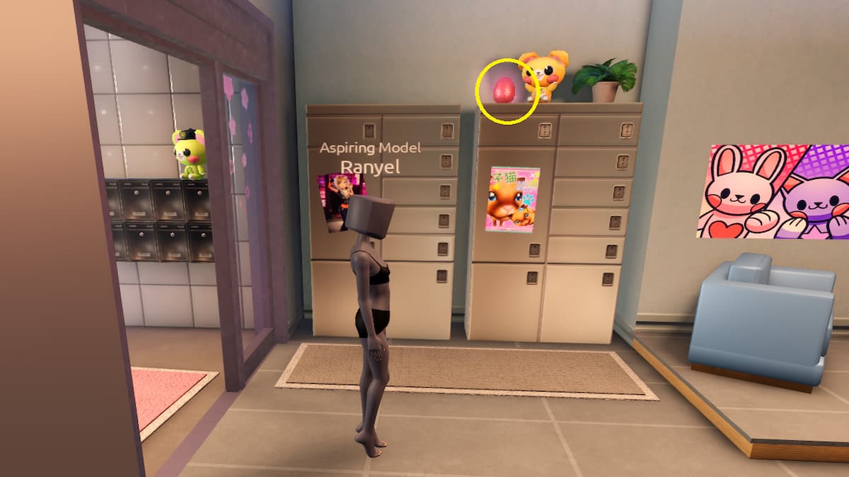 A pink Easter Egg is on top of the mailbox section, right at the entrance of the Sakura Heights Building, next to the yellow bear/kitty doll.