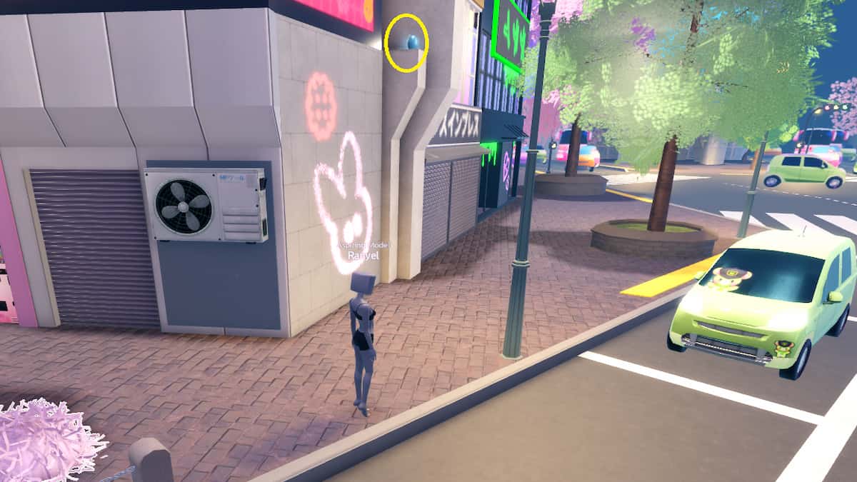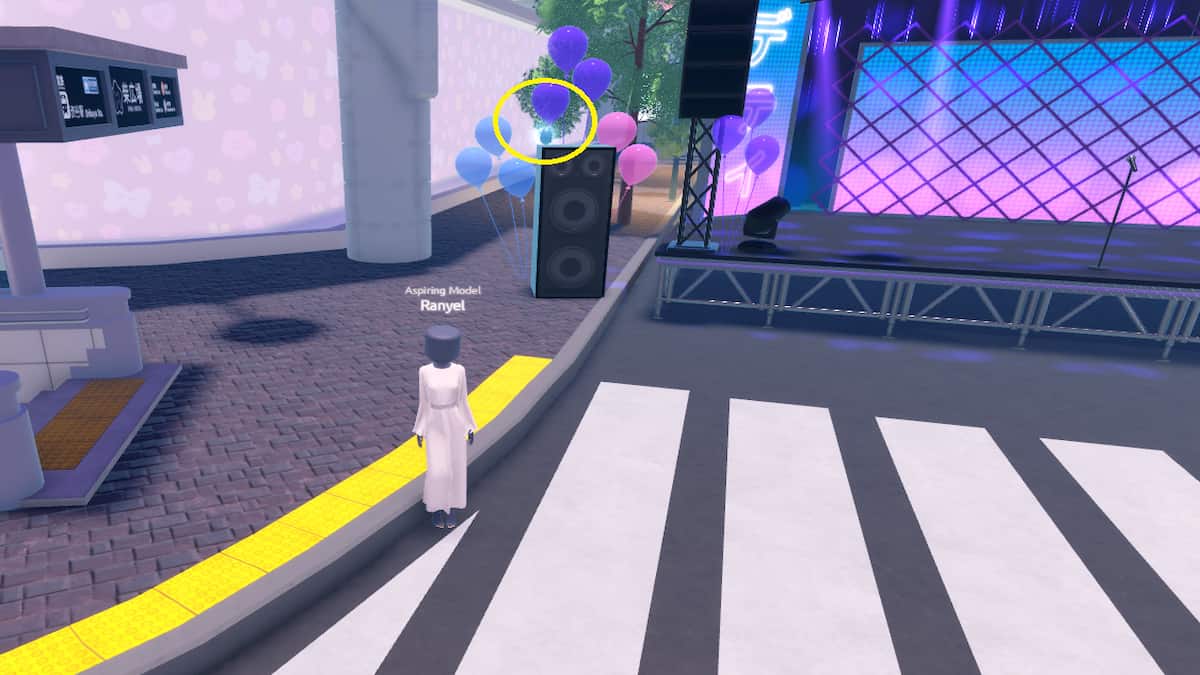 There is a blue Easter Egg on top of the speaker next to the performance stage. This is adjacent to the Cat Cafe, and you can reach the location by taking a right from your default spawn point.