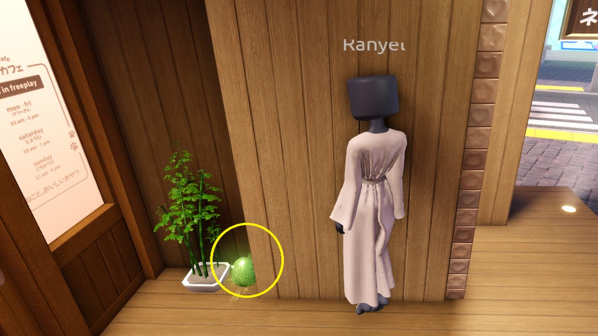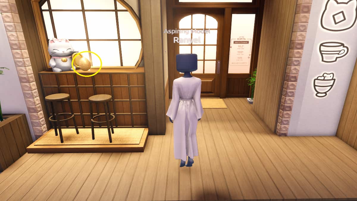 You can find an Easter Egg behind the Kirameki District Podium in front of the Cat Cafe.
