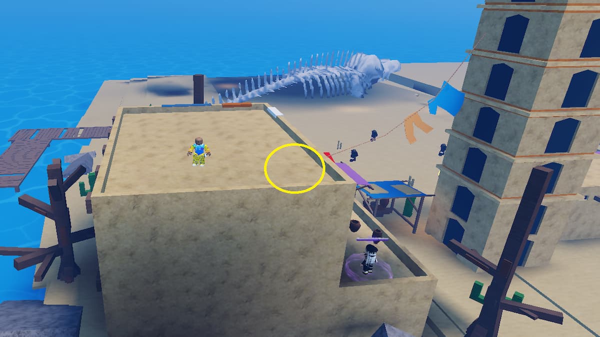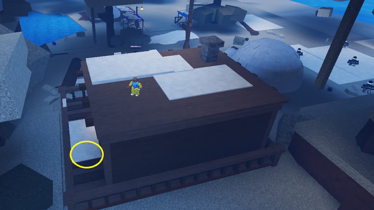 The next possible location for an Ancient Fragment to spawn inside the Sailor Piece is the Snow Island. Upon reaching the location, head to the cabin on the right side of the island and check the area below the window, as shown in the image above.