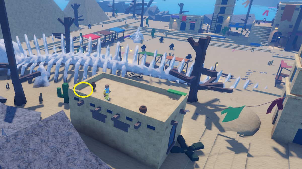 Right behind the large skeleton, you will find a small building. Check on top of this small building to locate an Ancient Fragment. This building is right in front of the Teleporter portal for the Desert Island.