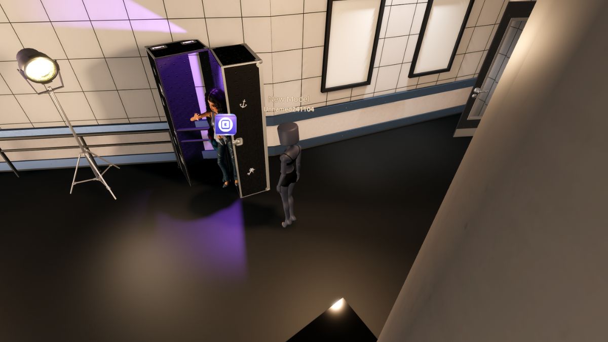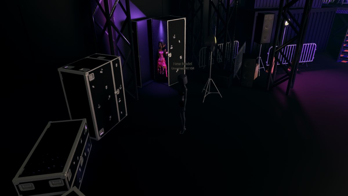 To continue your Katseye member gathering process, return to the dark room where you spawned and go towards the wall on the left side, the one opposite to where the stairs are. You will see some black cases lined up there, and the second member is hiding in the one farthest from the entrance, specifically the one behind the spotlight. This cabinet will also glow red when you approach it, so you should have even less trouble finding this member.