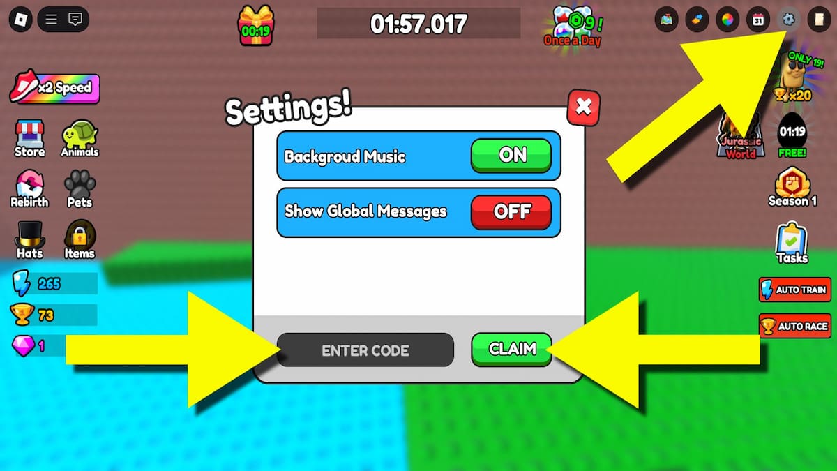 - Playtime rewards—Click the gift icon in the top-left corner often. You can claim free speed, wins, potions, and even cool pets such as the Eternal Star. New rewards appear every few minutes!