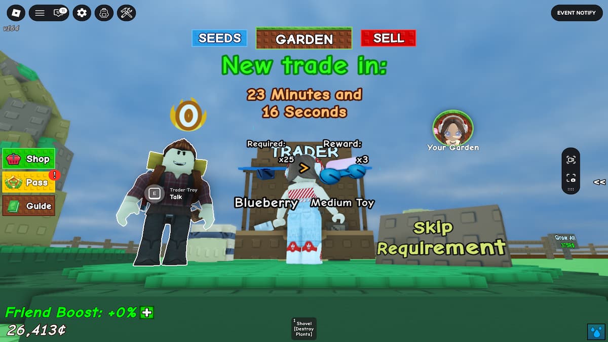 However, sometimes The Trader will require players to have items that take a longer time to grow to trade for the item he has listed. In this case, you can either look to trade with another player, hope that the seed is available in shop and then use boosts to make the seed grow faster. You can also choose to "Skip Requirements," but keep in mind that this ability uses Robux .