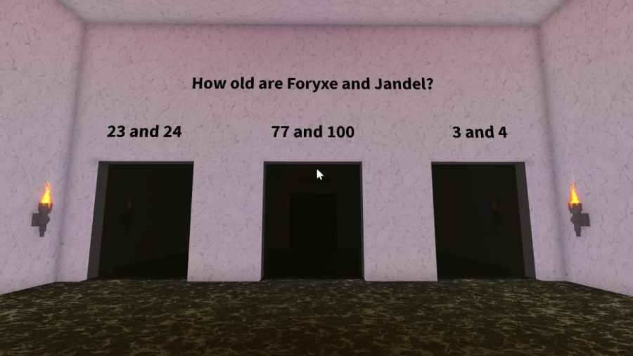 Foryxe and Jandel are 23 and 24 years old. The correct door to pass through is the door on the very left, with 23 and 24 just above the door. Proceeding through this door will safely lead players to the next trivia question.