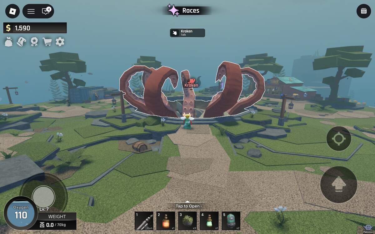 The Pufferfish Tube costs a whopping $2,850 and can be purchased from the Tubes shop. Again, you must explore the map to find the remaining Treasure Chests. Note that the other two chests are in the water so you'll need to use the Tube to reach them. Once you've completed all the tasks, head back and talk to the Kraken.