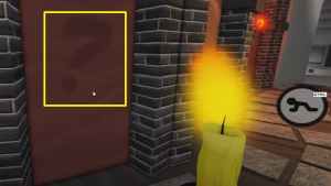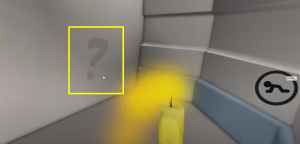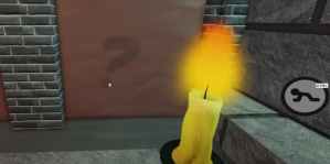 After grabbing the candle, head to the room with the swinging battleax. Across the room there is a question mark on the left wall. The question mark is painted in white and the only way to activate it is by brushing up against it with the candle. Upon doing so, a portal will appear on the wall that you can step through. Step through the portal.